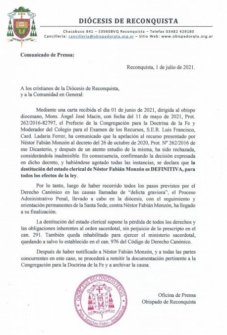 El Obispado de Reconquista dio a conocer esta decisión a través de un comunicado de prensa, donde se detalla que “se confirma la decisión de la destitución del estado clerical definitivo de Monzón”.