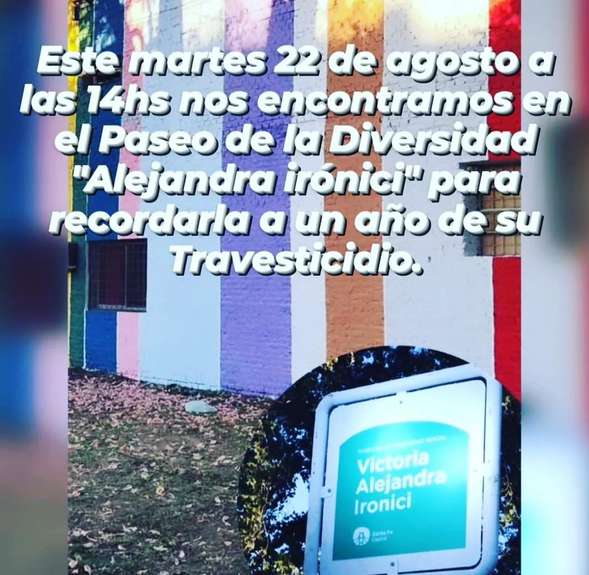 Este lunes 21 de agosto se cumple un año del transfemicidio de la activista LGBT+ Alejandra Ironici en la ciudad de Santa Fe. Sus compañeras, compañeros y compañeres le harán un homenaje el martes a las 14 en el Paseo de la Diversidad que lleva su nombre ubicado en Pedro Vittori 3803.