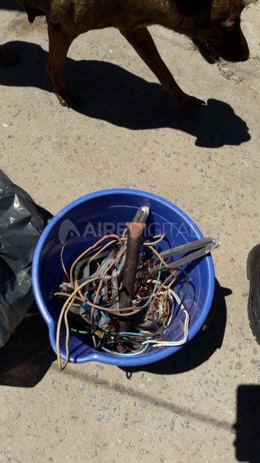 Además, en el allanamiento se secuestraron varios elementos que fueron robados de la antena: una extensión de cable monofásico, envainado de color negro con un macho de plástico de color naranja, con tres patas introducido en el interior de una bolsa de residuo de color negro; un balde de plástico de color azul con manijas de color negro que en su interior tenía trozos de aluminio de medio metro; un caño de 25 centímetros de cables varios de cobres pelado; dos bochas de metal con orificios con roscas; cables de 3,5 aislante de color negro; un tubo de material aislante de color verde con la inscripción numérica y letras, con tres aislantes de color negro; una vaina de cable de color celeste de 2, 30 metros; un cable recubierto de alambre de cobre de dos filamentos; un aislante similar de 17 centímetros recubierto de plástico de color blanco en su interior caños del mismo y cobre; y una vaina de cable de color lila y negro conteniendo cinco aislantes de hilo de seda de 44 centímetros.