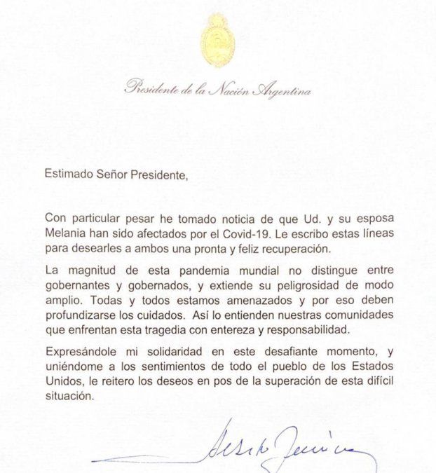 Mediante la misiva, el presidente de Argentina, le expresó a Donald Trump que “con pesar he tomado noticia de que ud. y su esposa, Melania, han sido afectados por coronavirus”.