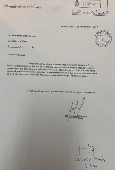 “Tengo el honor de dirigirme a la Sra. Presidenta del H. Senado, a fin de ratificar expresamente mi solicitud de licencia, según la presentación que por mi expresa indicación realizara mi jefa de despacho, como también los términos de la nota adjunta a dicha presentación y en la que obra mi sello de Senador de la Nación, documentos que oportunamente no pude suscribir por hallarme de viaje”, dice el documento.