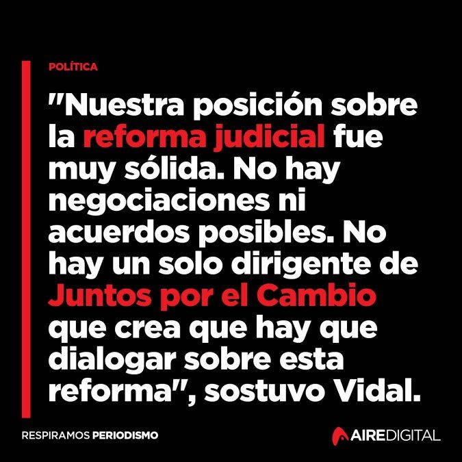 "Nuestra posición sobre la reforma judicial fue muy sólida. No hay negociaciones ni acuerdos posibles. No vamos a negociar lo que creemos. No hay un solo dirigente de Juntos por el Cambio que crea que hay que dialogar sobre esta reforma. Están en juego valores fundamentales que defendemos", sostuvo Vidal.