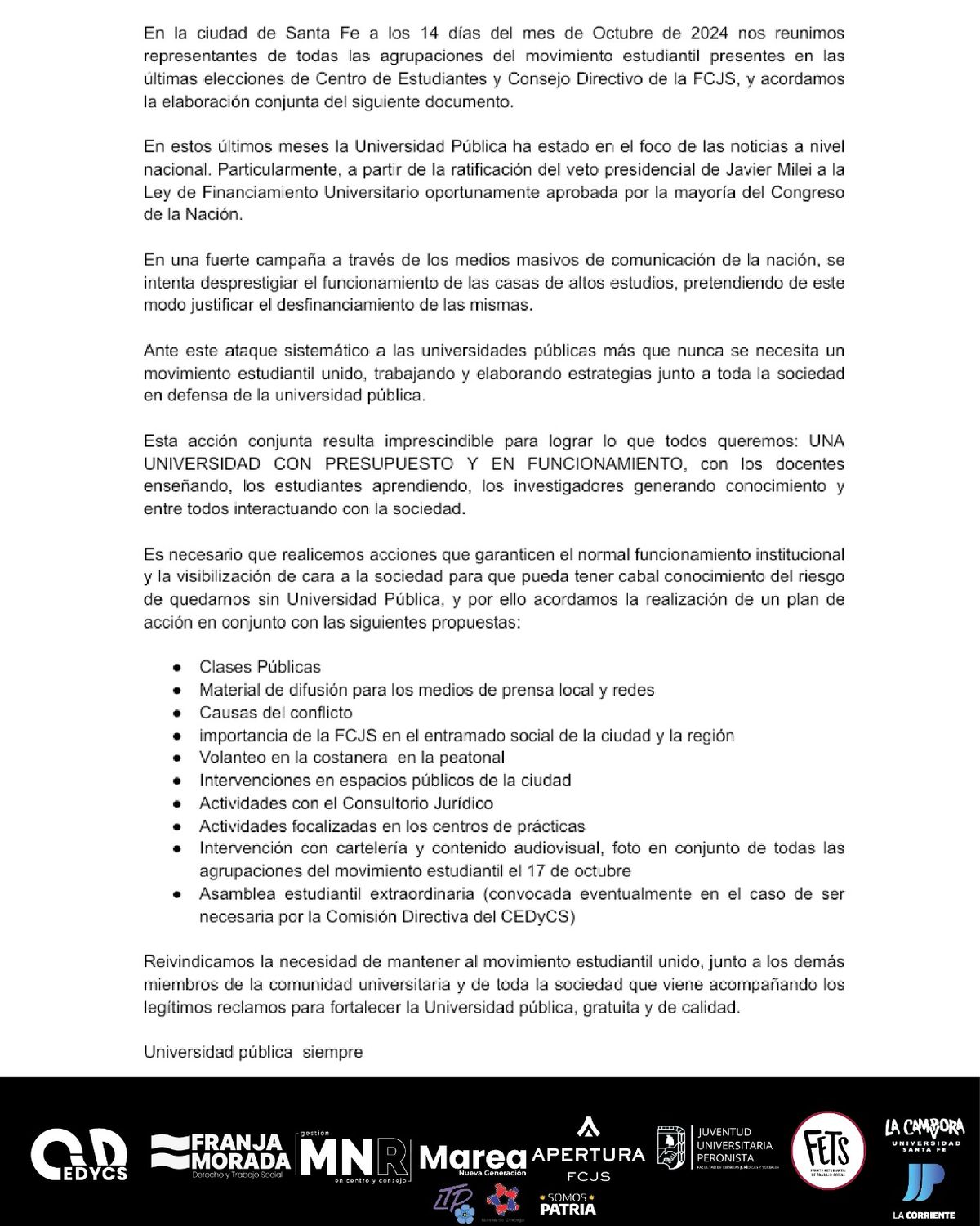 En el marco del latente conflicto entre estudiantes, docentes y no docentes tras el veto del presidente Javier Milei a la ley de financiamiento universitario, este lunes se realizaron varias asambleas estudiantiles en las facultades de la ciudad de Santa Fe.