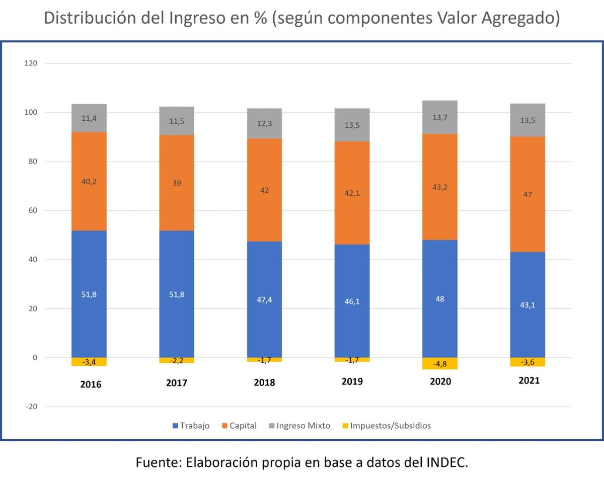 Más allá de la referencia recurrente a la distribución que el macrismo heredó de Cristina Kirchner en 2015, en la que el trabajo capturaba el 51,8% de las riquezas, el otro dato significativo es que desde que se inició la caída de la participación de los trabajadores en el reparto (2016 a 2021), el retroceso acumula un 13%, equivalentes a u$s 70.000 millones o su equivalente en moneda “blanda”, unos $7,7 billones de pesos. Para ponerlo en los términos del slogan del último coloquio de IDEA, los trabajadores ya cedieron, como pocas veces en la historia económica y social argentina y en el marco de un gobierno peronista, ahora les toca a los empresarios contribuir para intentar estabilizar un nuevo ciclo de crecimiento económico con justicia social.