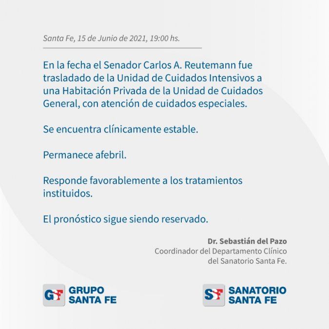 Mediante un parte dado a conocer este martes, el equipo médico del centro de salud informó que el senador nacional se encuentra clínicamente estable, afebril y responde favorablemente a los tratamientos. Por esta razón, se decidió su traslado a una habitación privada donde cuenta con atención de cuidados especiales. El comunicado indica que el pronóstico del ex corredor de Fórmula 1 continúa siendo reservado.