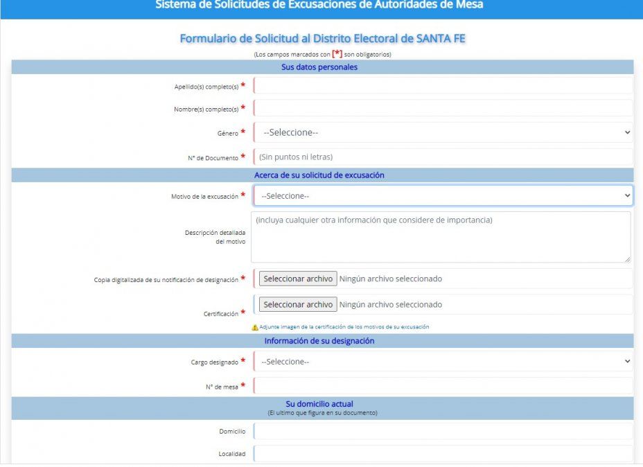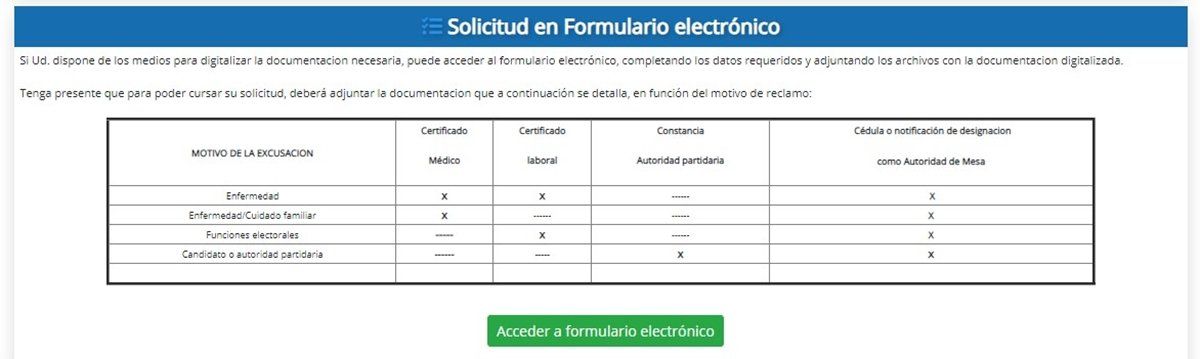 Para el formulario de excusarse se deberá adjuntar según el motivo para no ser autoridad de mesa certificado médico, laboral o constancia de autoridad partidaria; las opciones de excusa son enfermedad, cuidado de familiar enfermo, funciones electorales o candidato o autoridad partidaria.