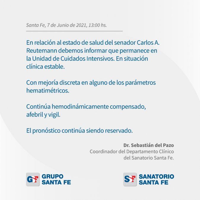 Mediante un parte médico dado a conocer este lunes, el equipo médico del centro de salud informó que el exmandatario provincial "permanece en la unidad de cuidados intensivos, en situación clínica estable y con mejoría discreta en algunos de los parámetros hematimétricos". A su vez, se precisó que el Lole continúa hemodinámicamente compensado, afebril y vigil, aunque el pronóstico continúa siendo reservado.