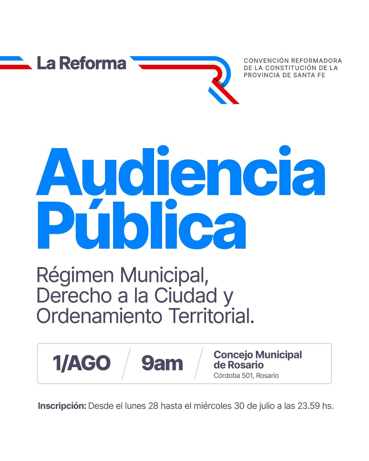 En el marco del proceso de reforma de la Constitución de la Provincia de Santa Fe, la Convención Reformadora realizará una audiencia pública en la ciudad de Rosario para abordar temas vinculados al Régimen Municipal, el Derecho a la Ciudad y el Ordenamiento Territorial.