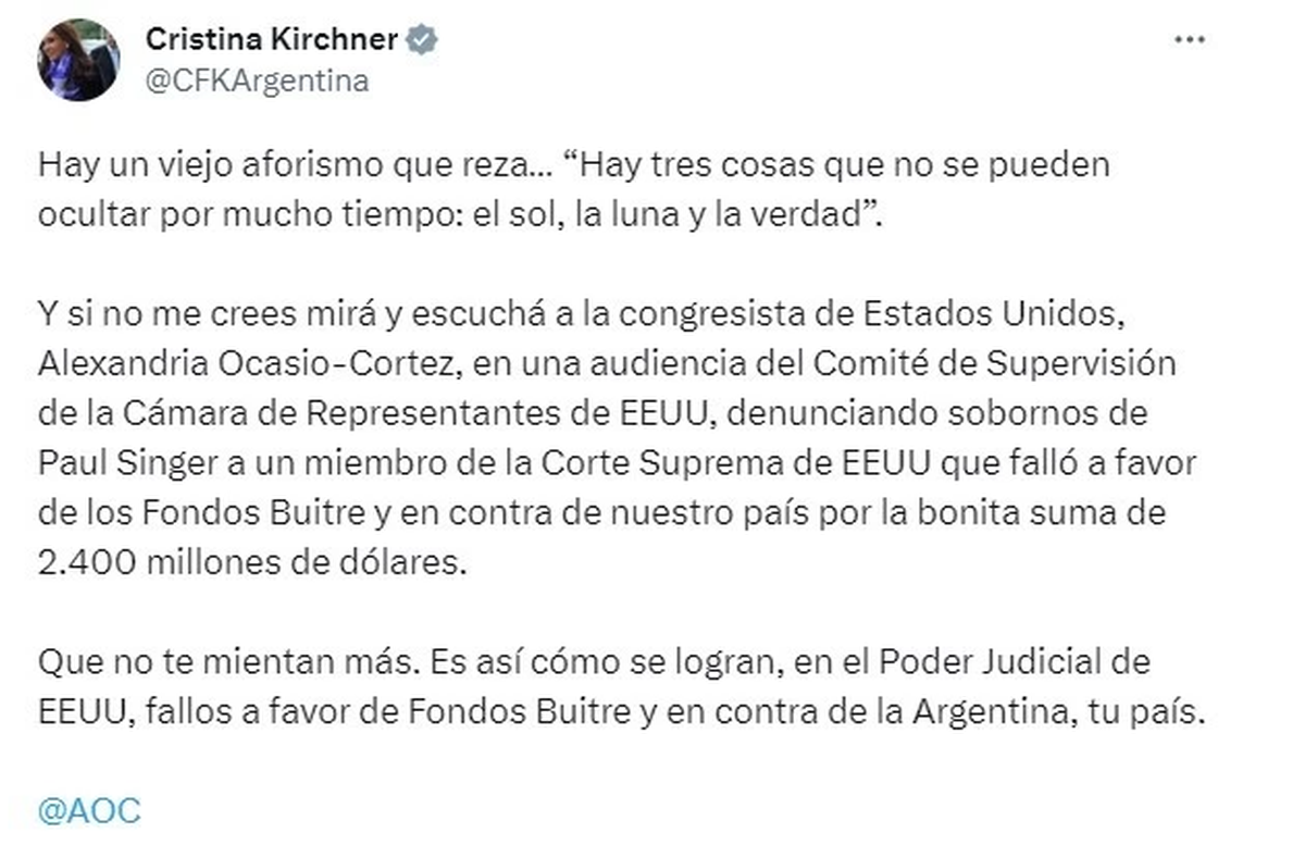 "Y si no me crees mirá y escuchá a la congresista de Estados Unidos, Alexandria Ocasio-Cortez, en una audiencia del Comité de Supervisión de la Cámara de Representantes de EEUU, denunciando sobornos de Paul Singer a un miembro de la Corte Suprema de EEUU que falló a favor de los Fondos Buitre y en contra de nuestro país por la bonita suma de 2.400 millones de dólares", indicó la vicepresidenta.