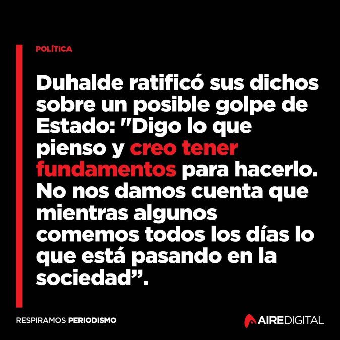 El ex presidente Eduardo Duhalde ratificó este martes por la mañana sus dichos respecto a la posibilidad de un golpe de Estado y aseguró que los dirigentes políticos no se dan cuenta de "lo que está pasando con la sociedad pobre y con las clases medias que se desmoronan".