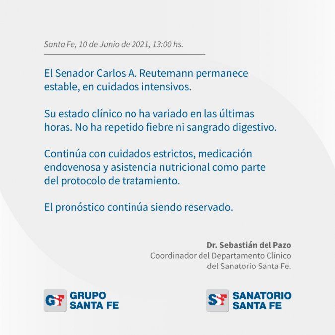 El pronóstico de Reutemann continúa siendo reservado, y es tratado con cuidados estrictos, medicación endovenosa y asistencia nutricional.