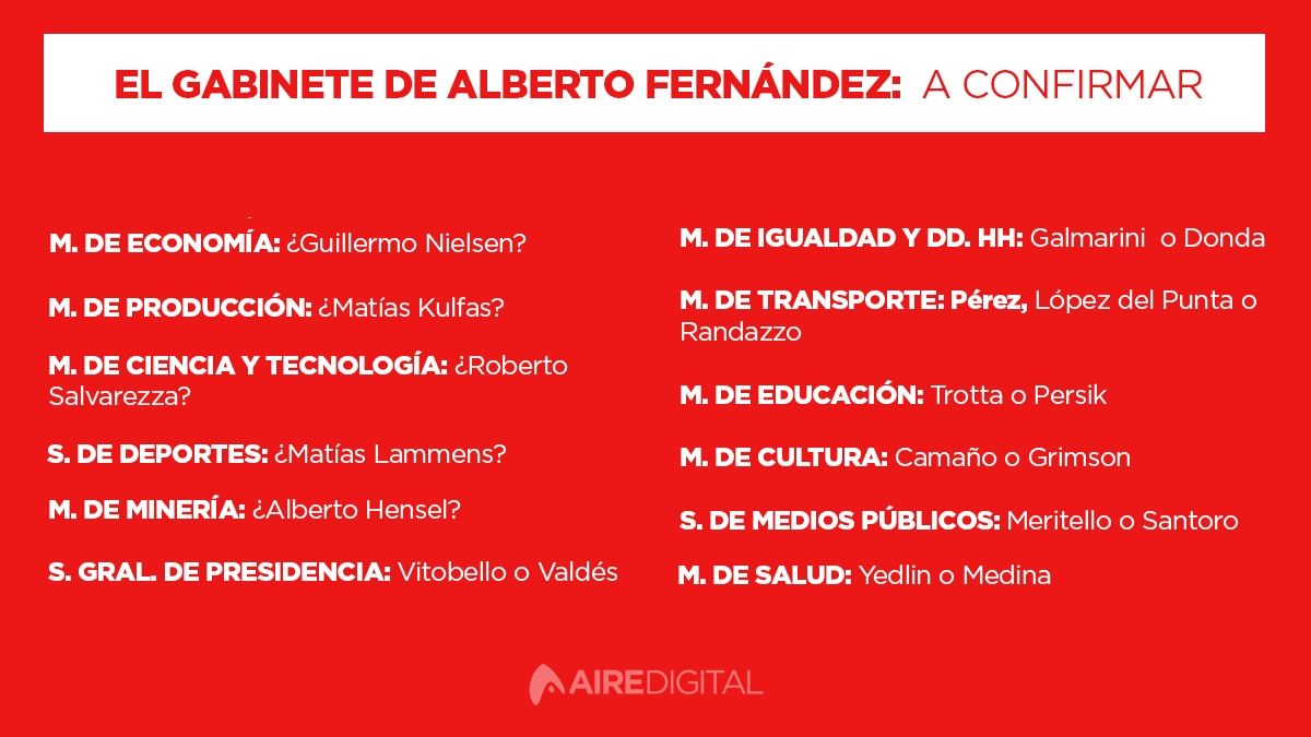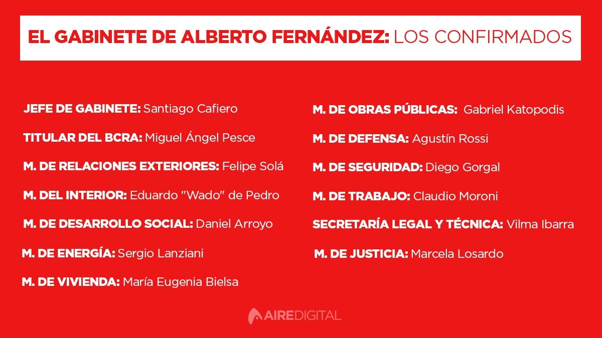 Los confirmados hasta el momento son: Santiago Cafiero como jefe de Gabinete de ministros; Vilma Ibarra como secretaria Legal y Técnica; Miguel Ángel Pesce como el titular del Banco Central de la República Argentina (BCRA); Felipe Solá como ministro de Relaciones Exteriores; Eduardo "Wado" de Pedro como ministro del Interior; Daniel Arroyo como ministro de Desarrollo Social; Sergio Lanziani como ministro de Energía, Marcela Losardo como ministro de Justicia; María Eugenia Bielsa como ministra de Vivienda; Gabriel Katopodis como ministro de Obras Públicas; Agustín Rossi como ministro de Defensa; Diego Gorgal como ministro de Seguridad y Claudio Moroni como ministro de Trabajo.