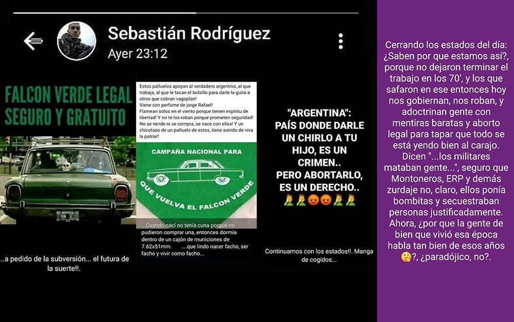 "En una de las publicaciones, observadas por todos sus contactos, publicó la imagen de un pañuelo verde en el que se puede ver un auto Falcon verde con la inscripción 'Campaña nacional para que vuelva el Falcon verde' y es por ello que atendiendo a la gravedad de los mismos y la simbología que representan, es que su denuncia penal resulta obligatoria", indicó el subsecretario.