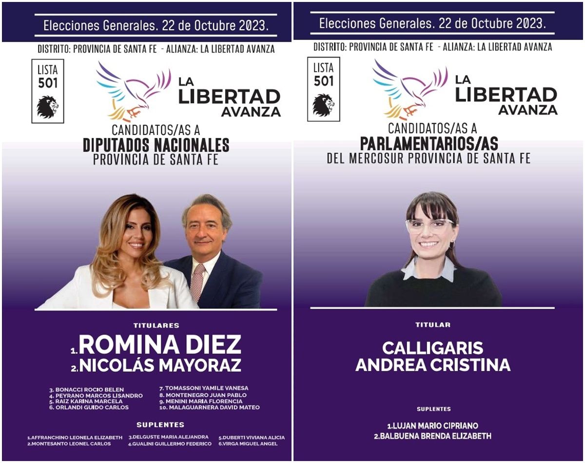 "La Libertad Avanza", el partido que lleva a Javier Milei como candidato a presidente, tiene a los siguientes postulantes a diputados nacionales por Santa Fe: Romina Diez, Nicolás Mayoraz, Rocío Bonacci, Marcos Peyrano, Karina Raíz, Guido Orlandi, Yamile Tomassoni, Juan Pablo Montenegro, María Menini, David Malaguarnera. En tanto, Andrea Calligaris es la candidata del Parlasur.