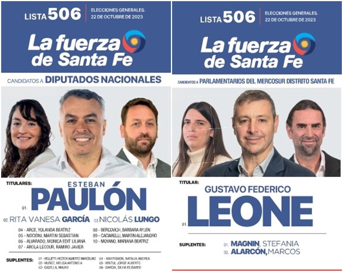Por su parte, "La Fuerza de Santa Fe", el espacio que acompaña la candidatura de Juan Schiaretti, tiene como candidatos a diputados nacionales a: Esteban Paulón, Vanesa García, Nicolás Lungo, Yolanda Arce, Martín Nocioni, Monica Alvarado, Ramiro Arola, Bárbara Bercovich, Martín Caciarelli y Mariana Moyano. En Parlasur, Gustavo Leone.