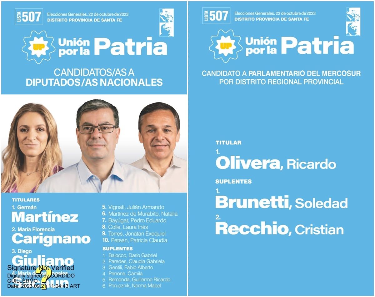 En "Unión por la Patria", los postulantes a la Cámara de Diputados de la Nación son: Germán Martínez, Florencia Carignano, Diego Giuliano, María de los Ángeles Sacnun,Julián Vignati, Natalia Martínez, Pedro Bayugar, Laura Colle, Jonatan Torres y Claudia Petean. Ricardo Olivera es el candidato al Parlasur.