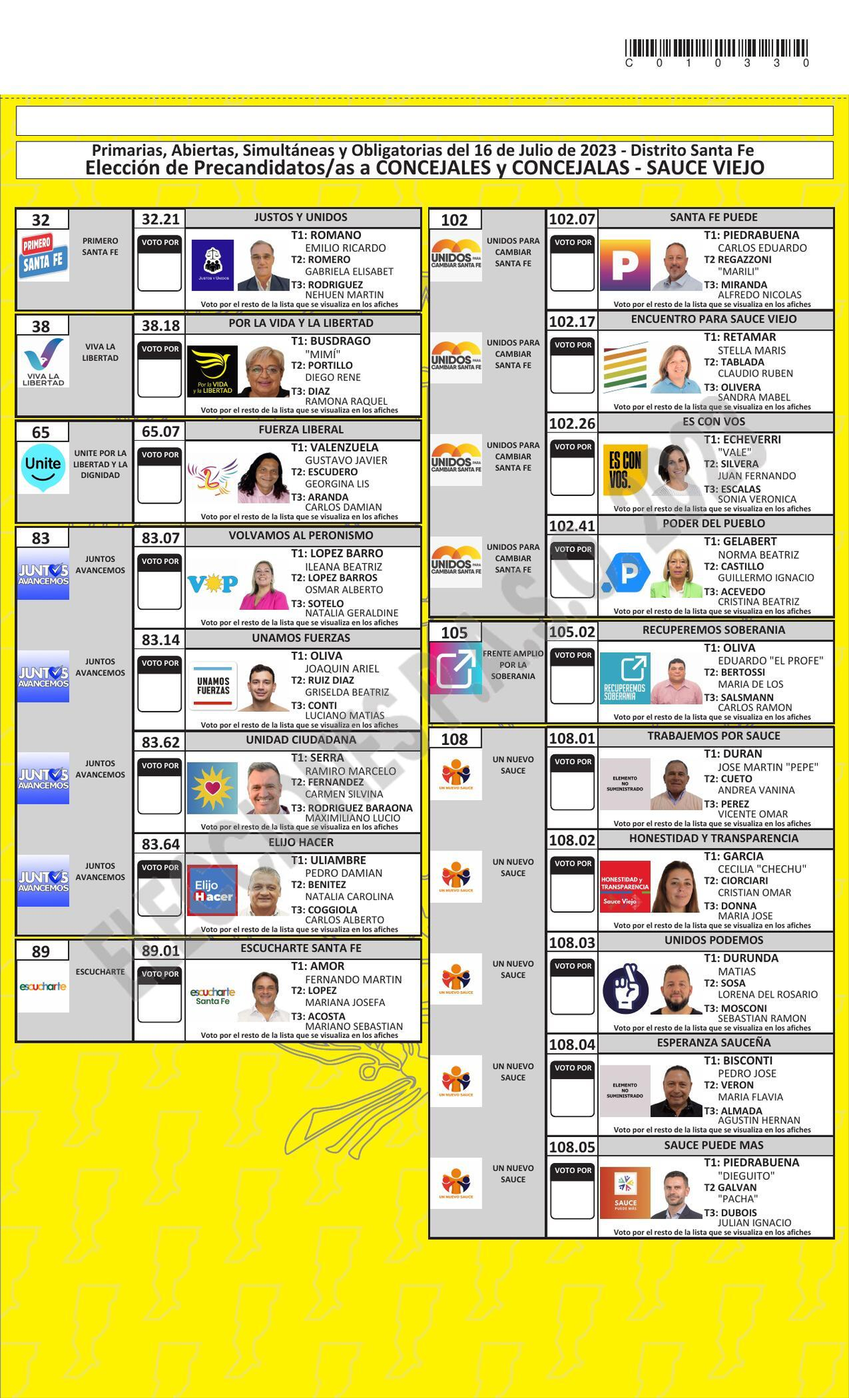 Esta es la boleta única de precandidatos a concejales de Sauce Viejo