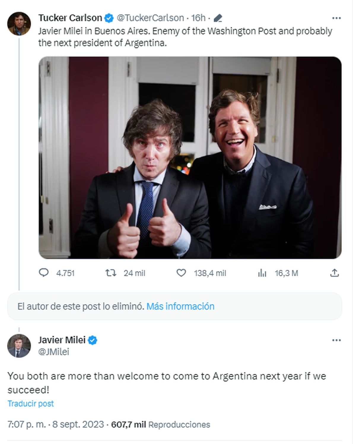 Ante los mensajes, Milei escribió en inglés: "You both are more than welcome to come to Argentina next year if we succeed!". Traducido, el legislador expresó: "¡Ambos son más que bienvenidos a venir a Argentina el próximo año si tenemos éxito!".