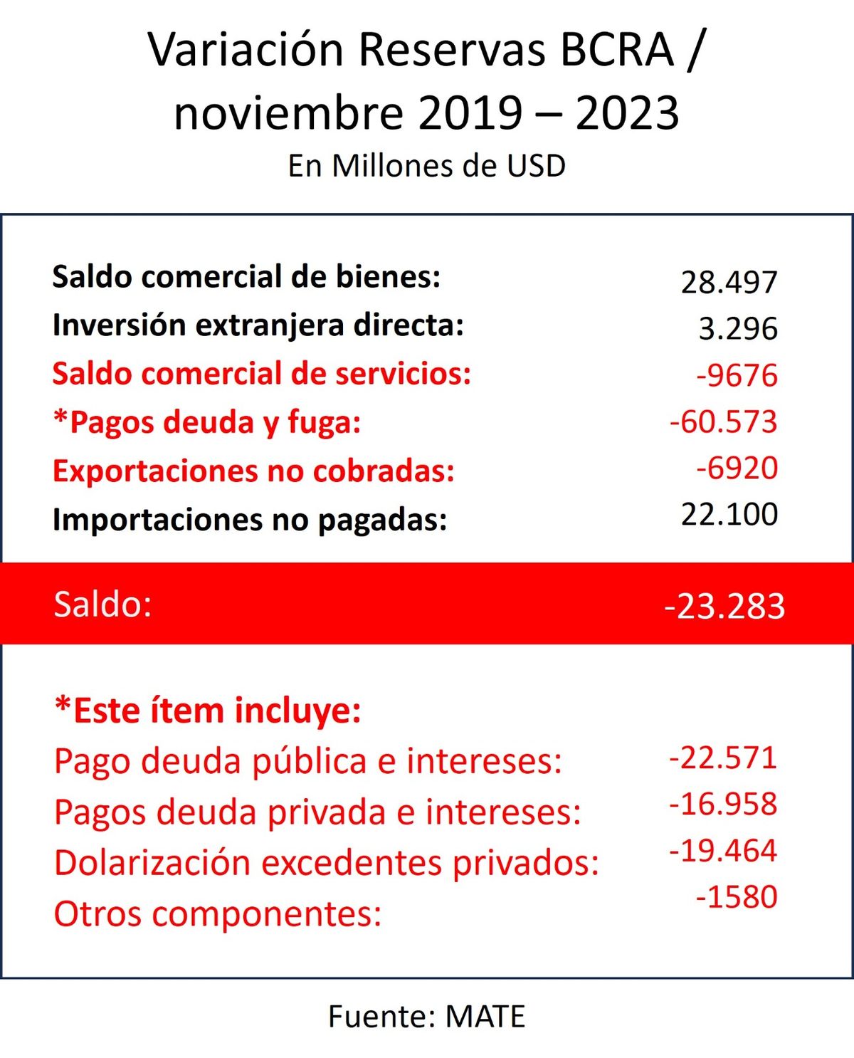 Como ya apuntamos, ninguna de las cifras viralizan los comunity managers y divulgadores televisivos del gobierno es real, sin importar el cálculo con que se construyan, ni el déficit fiscal heredado (4,5%, nunca 15%), ni el cuasifiscal, ni la deuda con importadores, ni la deuda pública de vencimiento inminente. Pero veamos algunas cifras de MATE sobre el principal problema apuntado: la incapacidad para retener los dólares generados por una economía creciente y la restricción externa.