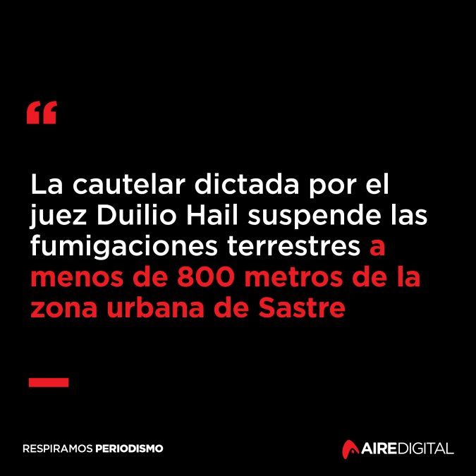 El pasado 5 de febrero, el juzgado de primera instancia en lo Civil y Comercial de Rafaela a cargo del juez Duilio Hail dictó una medida cautelar que suspende las fumigaciones terrestres a menos de 800 metros desde la finalización de la zona urbana de Sastre con cualquier tipo de agroquímico.