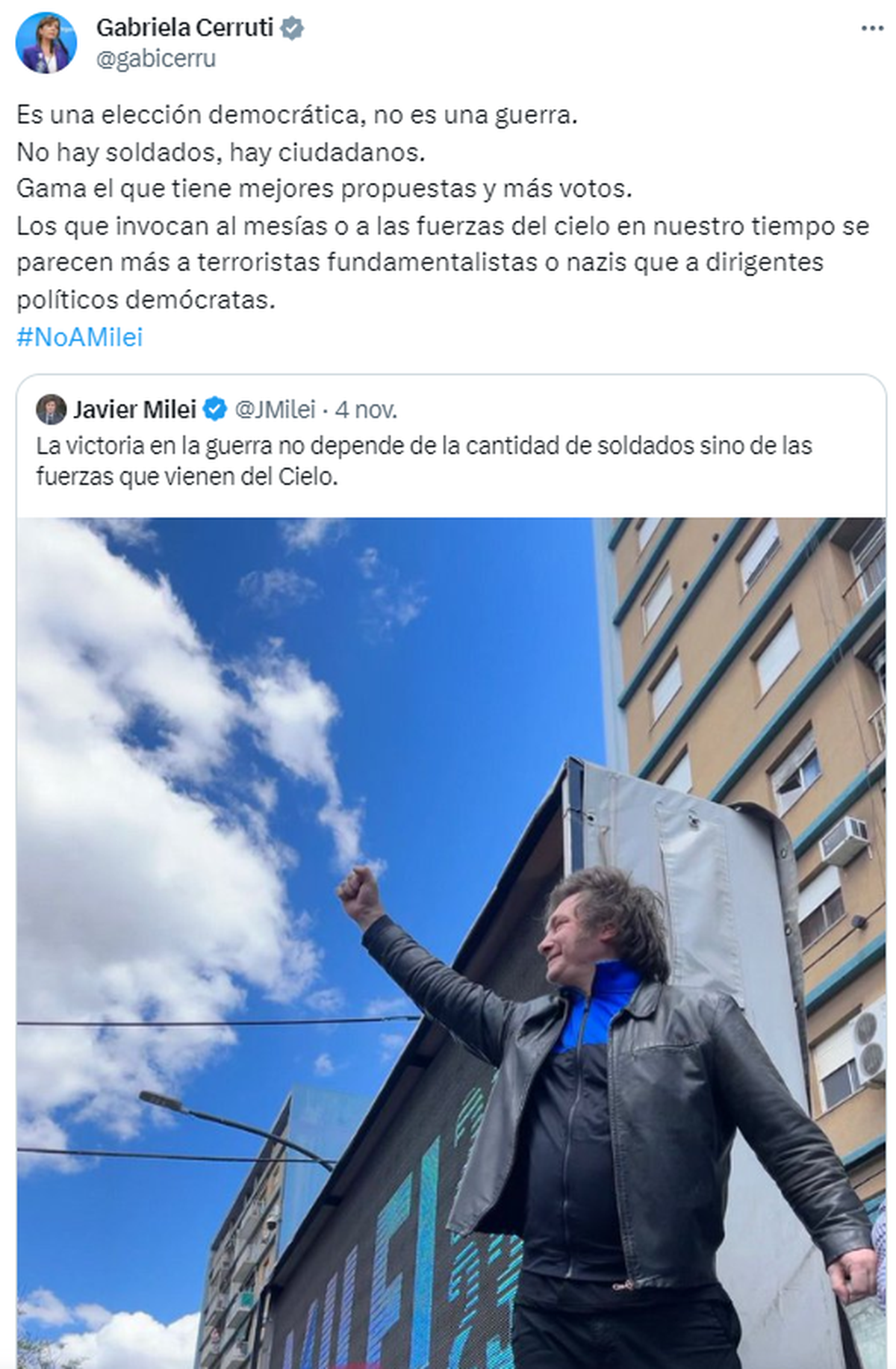 "Es una elección democrática, no es una guerra. No hay soldados, hay ciudadanos. Gama el que tiene mejores propuestas y más votos. Los que invocan al mesías o a las fuerzas del cielo en nuestro tiempo se parecen más a terroristas fundamentalistas o nazis que a dirigentes políticos demócratas", tuiteó con la leyenda "#NoAMilei"