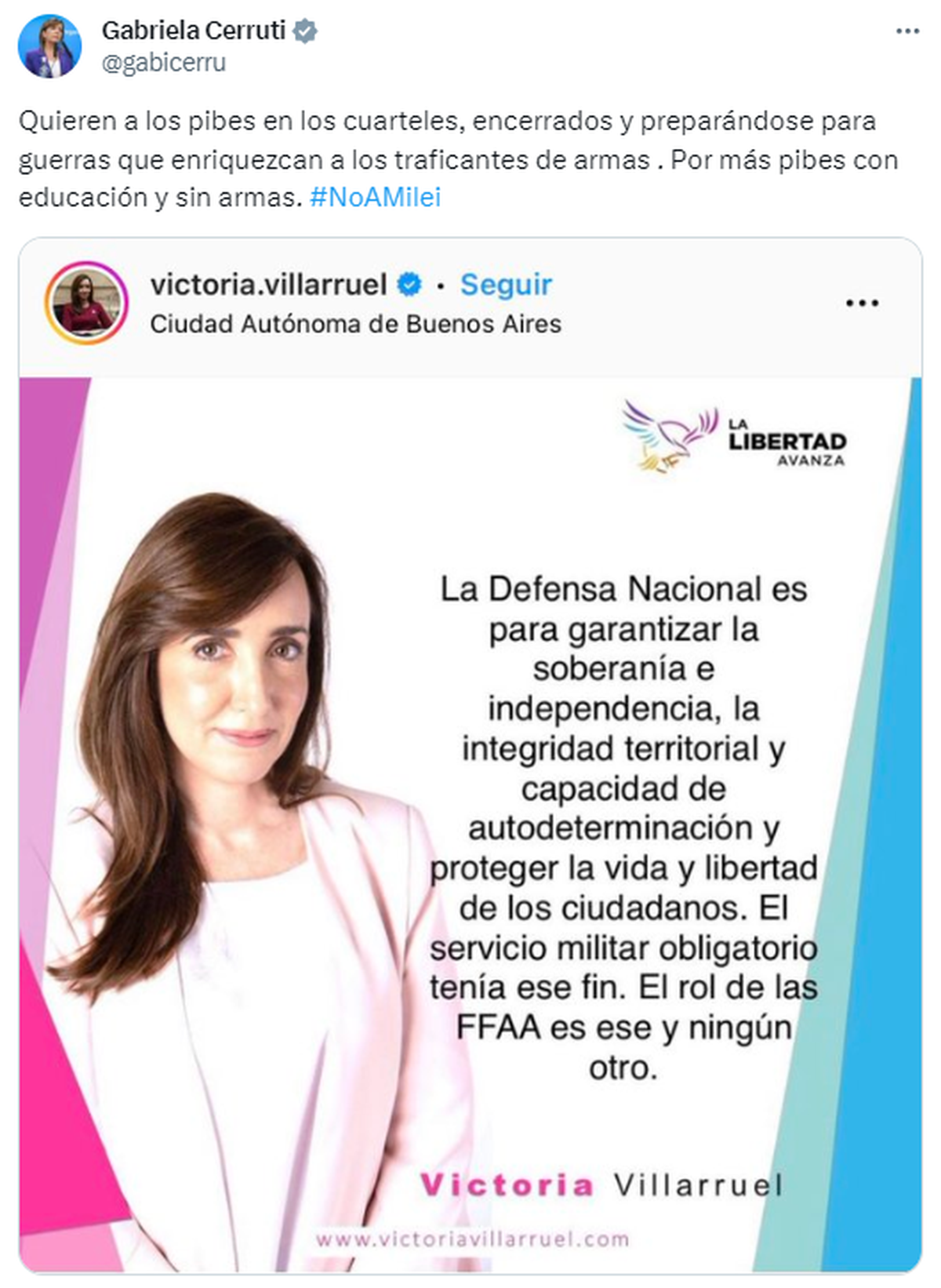 También citó unas declaraciones de Victoria Villarruel de mayo de 2022, en las que la candidata a vicepresidenta de La Libertad Avanza parecía abrirle la puerta a la posibilidad del retorno del servicio militar obligatorio.