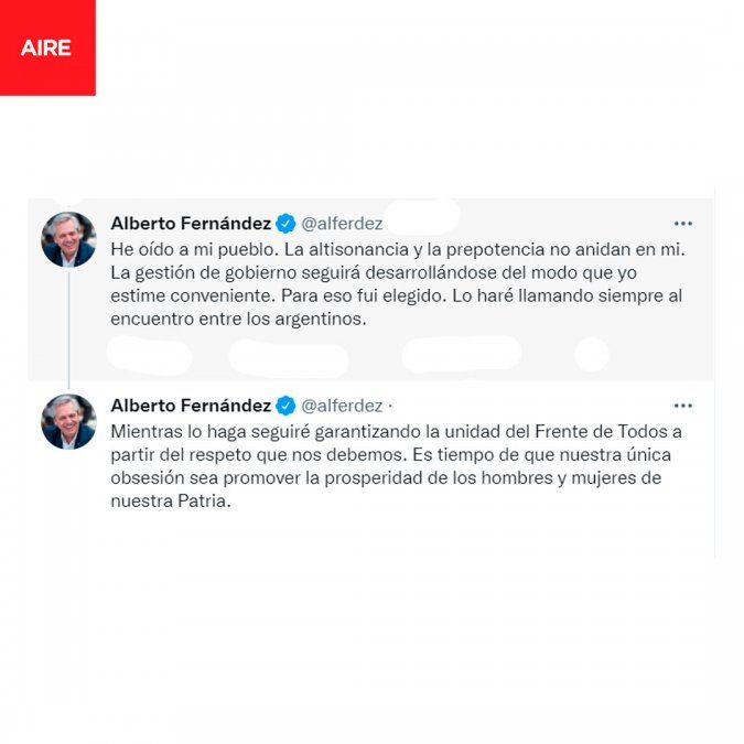 A su vez, Fernández se mostró firme al asegurar que “la gestión de gobierno seguirá desarrollándose del modo que yo estime conveniente, para eso fui elegido” y agregó: “lo haré llamando siempre al encuentro entre los argentinos. Seguiré garantizando la unidad del Frente de Todos a partir del respeto que nos debemos”.