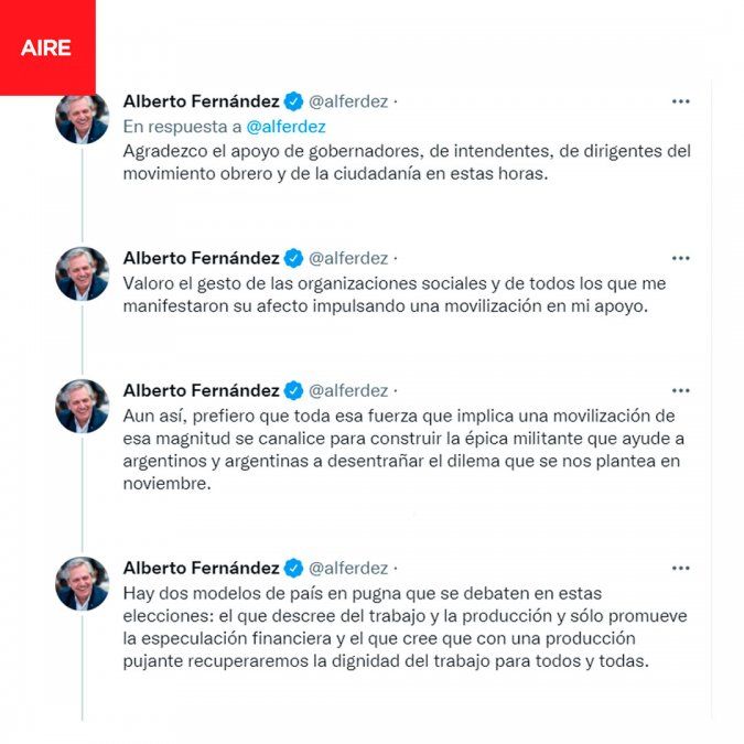Por otra parte, el mandatario agradeció el apoyo de "gobernadores, de intendentes, de dirigentes del movimiento obrero y de la ciudadanía en estas horas", valoró el "gesto de las organizaciones sociales y de todos los que me manifestaron su afecto impulsando una movilización en mi apoyo" pero pidió "que toda esa fuerza que implica una movilización de esa magnitud se canalice para construir la épica militante que ayude a argentinos y argentinas a desentrañar el dilema que se nos plantea en noviembre"