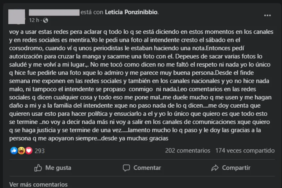 La mujer, que desde que se viralizó el video está involucrada en la polémica, insistió en que se acercó al intendente porque lo admira. De hecho, en su publicación indicó: “Me parece muy buena persona”.