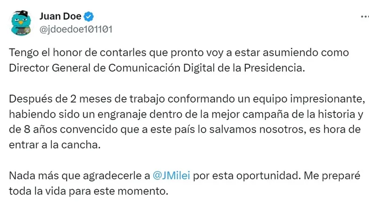 "Tengo el honor de contarles que pronto voy a estar asumiendo como Director General de Comunicación Digital de la Presidencia", publicó Doe en las últimas horas en su cuenta de la red social X, de la que es un activo participante.