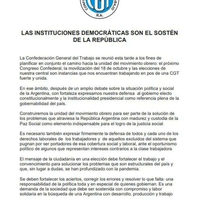 Daer formuló estos conceptos tras encabezar un encuentro de la mesa chica ampliada de la CGT con la participación de casi cuarenta gremios de diversas corrientes, a cuyo término señaló que "defendemos la institucionalidad de nuestro país enmarcada en los parámetros institucionales".