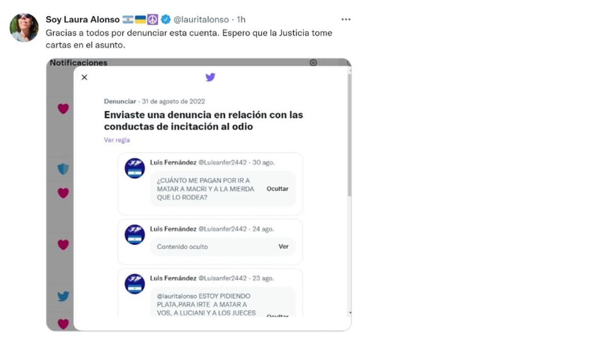 “¿Cuánto me pagan por ir a matar a Macri y a la mierda que lo rodea?”, escribió el 30 de agosto el usuario @Luisanfer2442, quien en su perfil muestra que se llama “Luis Fernández” y que nació el 10 de septiembre de 1972. La cuenta, cuya ubicación dice que es de Las Heras, Santa Cruz, fue deshabilitada.