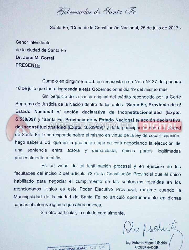 En este marco, la Municipalidad de Santa Fe pretendió incorporarse a las negociaciones entre la Provincia y la Nación. A través de una carta, el gobernador Miguel Lifschitz respondió el pedido del intendente José Corral, explicando que “en la presente etapa se está negociando la ejecución de una sentencia entre actora y demandada, únicas partes legitimadas procesalmente a tal fin”.