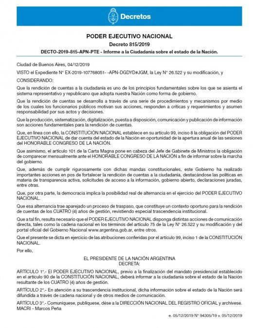 A través del decreto 815 publicado este jueves en el Boletín Oficial, el jefe de Estado dispuso que "el Poder Ejecutivo Nacional, previo a la finalización del mandato presidencial establecido en el artículo 90 de la Constitución Nacional, deberá informar a la ciudadanía sobre el estado de la Nación resultante de los cuatro años de gestión".