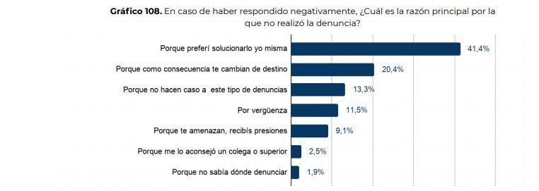 Solo el 10% denunció el acoso y más de la mitad de ese pequeño grupo sintió que no sirvió de mucho. Las que no se animaron a denunciar prefirieron resolverlo por sus propios medios, pero muchas desistieron de la denuncia por temor a traslados (20%), o porque sienten que no son escuchadas (13,3%), o por vergüenza (11%).