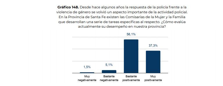 Además, el 82% considera necesario que sean mujeres las que atiendan a las víctimas que llegan a la Comisaría de la Mujer, aunque el plantel de mujeres es apenas el tercio del total de agentes de la fuerza en todo el territorio santafesino.