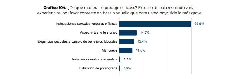 En su gran mayoría, se trataron de insinuaciones verbales o físicas (59,9%), seguidas por el acoso virtual o telefónico (14,7%); extorsiones a cambio de algún beneficio (12,4%), manoseos (11%), relaciones sexuales no consentidas (1,1%) y exhibición de pornografía (0,9%).