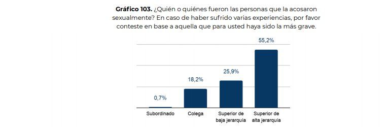 Del total de mujeres que dijeron haber sido acosadas, el 81% identificó a superiores de alta o baja jerarquía como los autores de dichos actos.