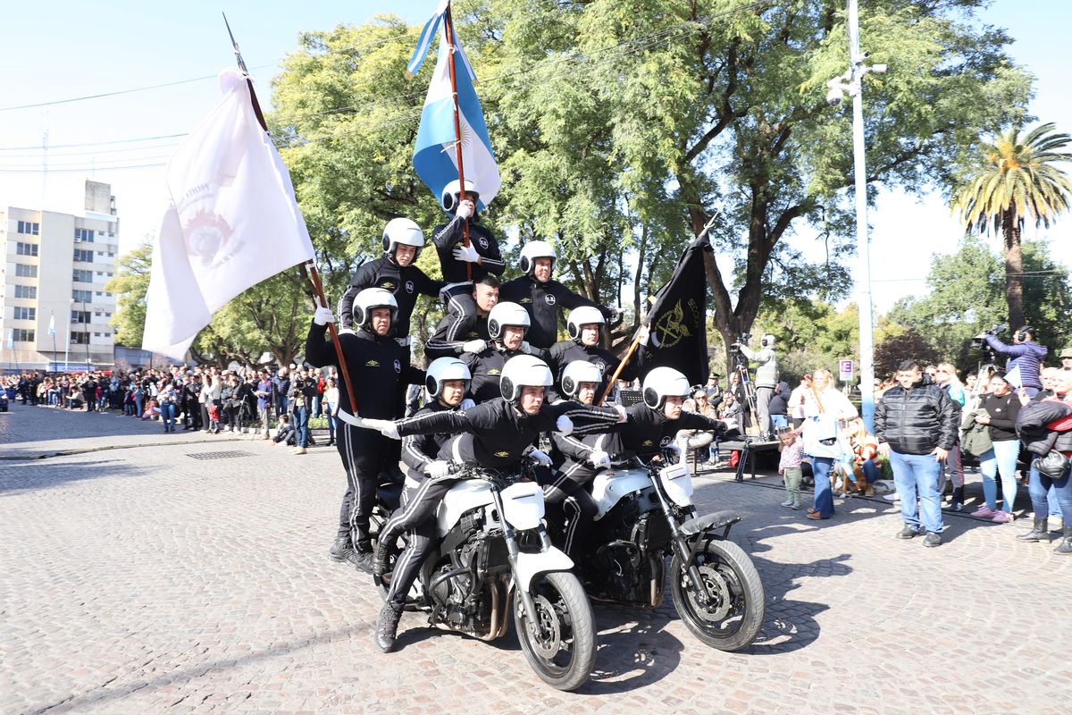 Posteriormente, el gobernador Perotti y las autoridades se cruzaron hasta la esquina de Moreno y Bv. Lehmann, donde se llevó a cabo el acto central con un desfile cívico-militar y la actuación de artistas locales.