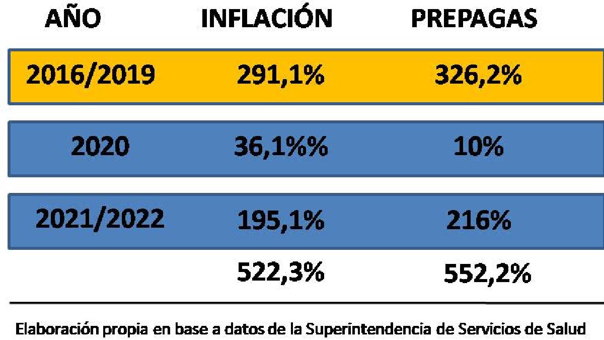 El ejercicio consiste en los datos de los aumentos efectivamente permitidos por la Superintendencia de Servicios de Salud (en nombre del Ministerio de Salud y según decreto reglamentario 66/2019 del macrismo, aún no derogado) contra la inflación efectivamente registrada para cada período. La diferencia es de 29,9% a favor de las prepagas, pese a la queja de Belocopitt sobre el año clave de la pandemia, el 2020. Porque también es justo decir que si bien los aumentos se regularon protegiendo el bolsillo y la salud de les argentines, las prepagas habían acumulado un 35% de rentabilidad por encima de la inflación durante el macrismo y sólo perdieron 26% en ese año crítico para todes, con trabajadores que no tenían rentabilidades acumuladas para soportar una crisis sanitaria, económica y política de escala planetaria.