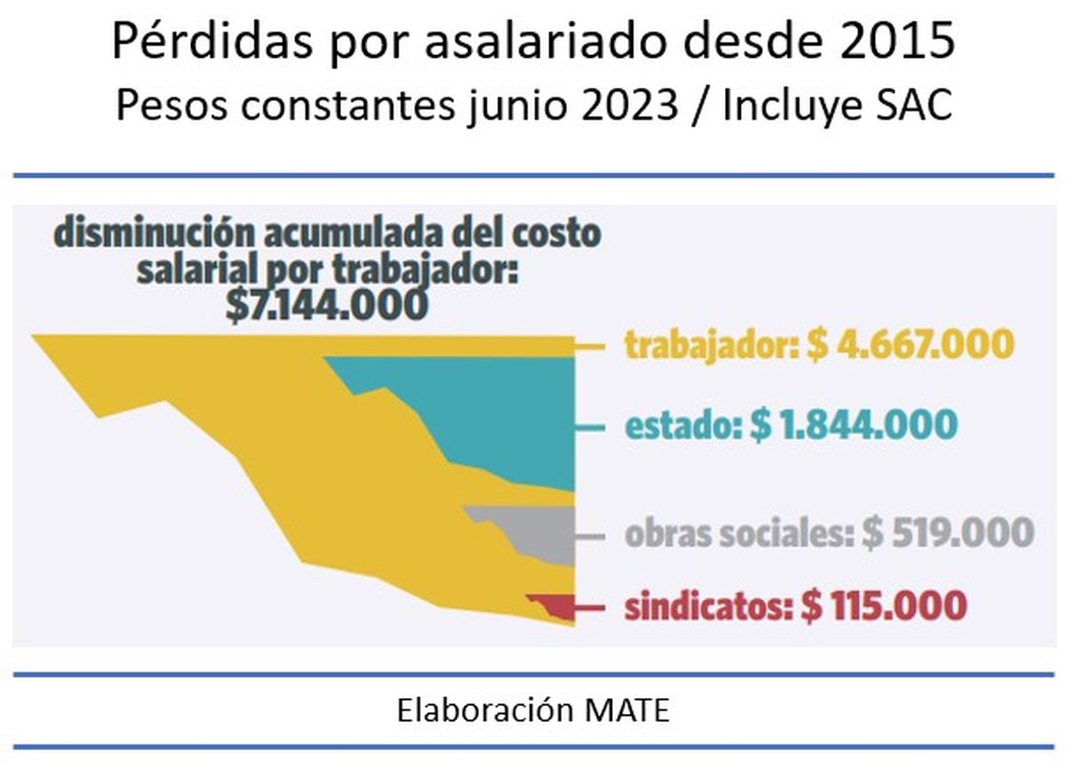 De tal modo, el bolsillo de cada trabajador perdió sin remedio más de 4,5 millones de pesos desde 2016 y el Estado dejó de recaudar de manera directa 1,8 millones por cada uno de los 6 millones de empleados privados registrados, lo que suma un monto equivalente a 12 impuestos a las grandes fortunas.