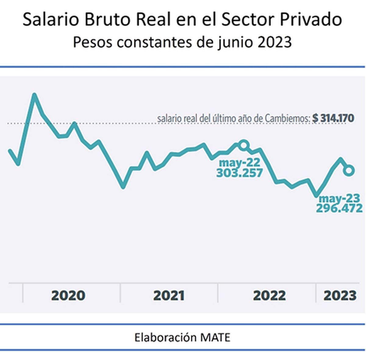 Según el Informe de julio de 2023 de MATE y exceptuando el breve efecto de la aplicación de sumas fijas en enero 2020, el nivel real del salario de los privados registrados estuvo siempre por debajo del valor promedio del último año de Cambiemos.