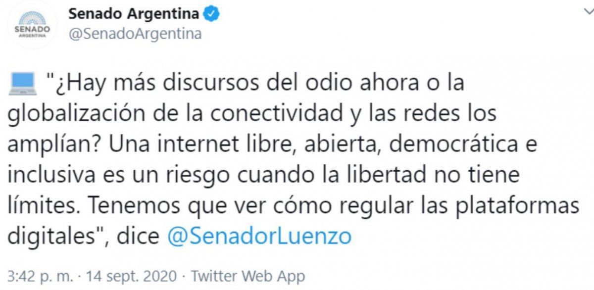 “A veces uno tiene la sensación que desaparece en este ámbito el Superyó y que no hay límites a las condiciones morales que tiene que tener el ser humano para hablar con el otro”, reflexionó el senador kirchnerista, antes de apuntar que por eso debería ponerse en marcha “el debate de la regulación o no de las plataformas digitales y hasta dónde llegar”.