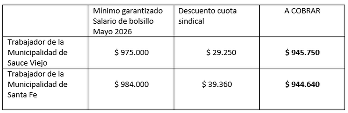 La Municipalidad de Sauce Viejo informó que el mínimo garantizado de bolsillo que deberá cobrar un trabajador de Sauce Viejo llegará a $975.000 en el mes de mayo 2026, sujeto al descuento del 3% de cuota de afiliación a Festram, suma a la que debe adicionarse el correspondiente presentismo.