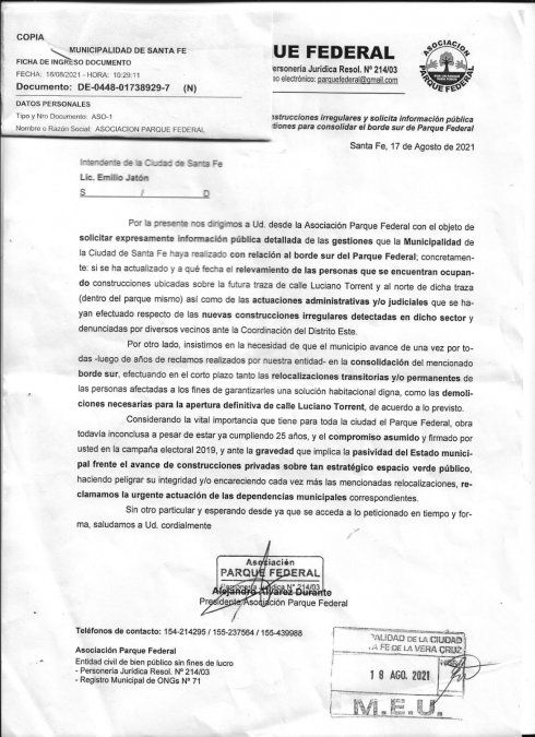 La Asociación del Parque Federal presentó al Municipio una lista con "16 intervenciones para mejorar el espacio" ubicado en la ciudad de Santa Fe. Además, siguen reclamando que la obra está "inconclusa" y piden una guardia municipal preventiva.