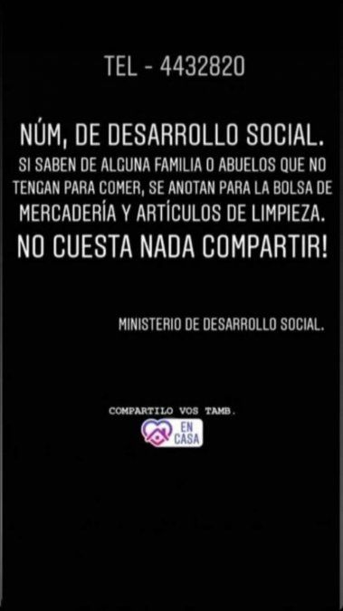 “4432820, teléfono de Desarrollo Social. Si saben de alguna familia o abuelo que no tenga para comer, se anotan para la bolsita de mercadería o artículos de limpieza. No cuesta nada compartir”, es lo que reza la publicación que se compartió incontables veces en Whatsapp y otras redes sociales.