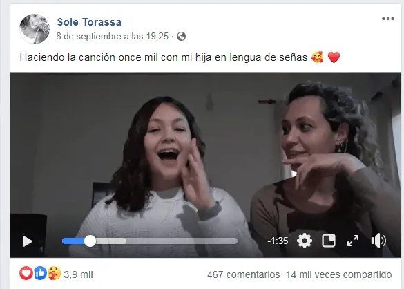 14.232 personas compartieron el video. Otras 3.922 reaccionaron con un ‘Me Gusta’ o ‘Me Encanta’. Acumula 612.849 reproducciones. 467 usuarios lo comentaron. Estos impresionantes números –al momento que esta nota se redactó- tenía en Facebook el video que grabó en su casa de Rivadavia Soledad Torassa y su hija Delfina Chiconi, de 11 años, interpretando la canción ‘Oncemil’ de Abel Pintos en lengua de señas.