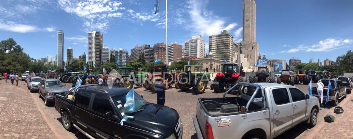 Productores rurales autoconvocados del sur santafesino se concentraron este viernes por la mañana en el cruce de las rutas nacionales 34 y AO12 y desde allí marcharon hasta el Monumento Nacional a la Bandera de Rosario en protesta "por la suba de retenciones y del proyecto de aumento de impuestos provinciales".