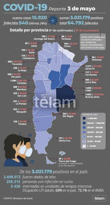 Otras 540 personas murieron y 15.920 fueron reportadas con coronavirus en las últimas 24 horas en la Argentina, con lo que suman 64.792 los fallecidos y 3.021.179 los contagiados desde el inicio de la pandemia, informó el Ministerio de Salud.