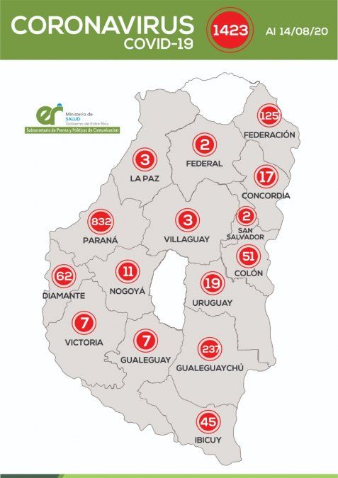 Uno de los confirmados en días anteriores, fue reclasificado a otra provincia –Córdoba-. Por tal motivo, se resta un caso a la ciudad de Concordia. De ese modo, en la provincia son 1.423 los casos confirmados.